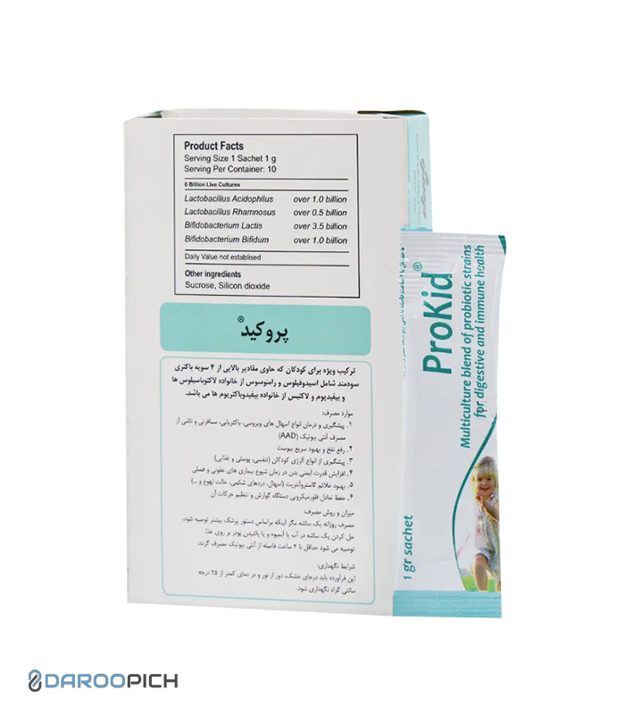 ساشه پروکید گسترش میلاد فارمد مکمل پروبیوتیک به فرم پودر ساشهای حاوی سویههای مفید روده, کمک به تقویت گوارش، کاهش نفخ، یبوست و تقویت سیستم ایمنی کودکان و بزرگسالان