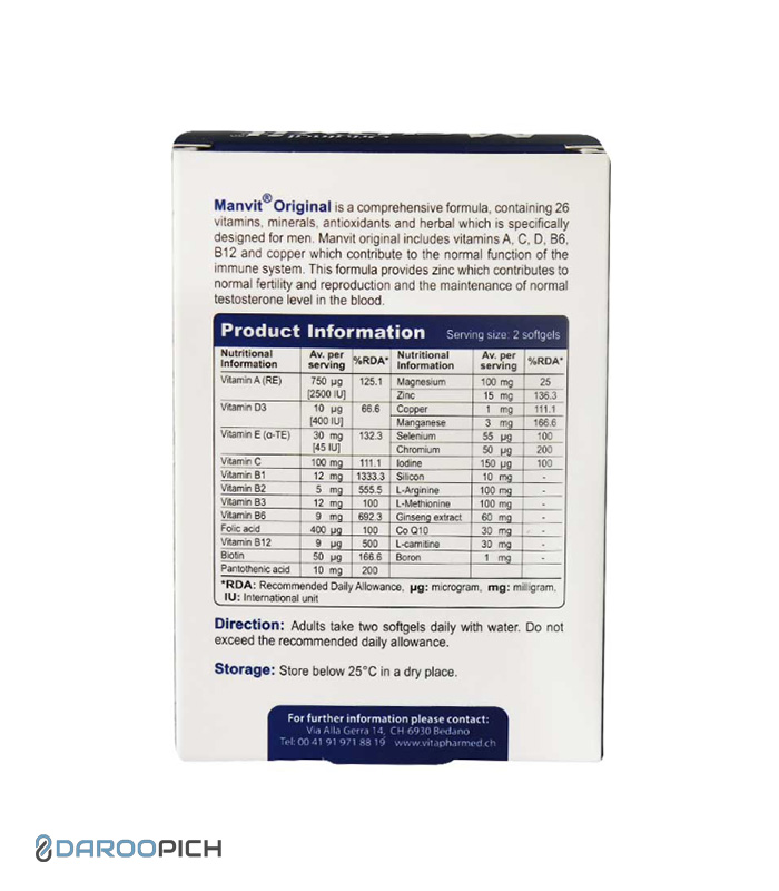 - ویژگیها: مولتیویتامین کامل، تقویت قوای جسمی و ذهنی، افزایش انرژی، حمایت از سلامت مردان.