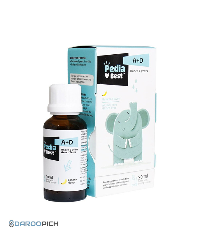 قطره ویتامین آ+د پدیابست با طعم موز (Pediabest Vitamin A+D Drops with Banana Flavor) مکملی حیاتی برای تأمین ویتامینهای A و D مورد نیاز نوزادان و کودکان است.