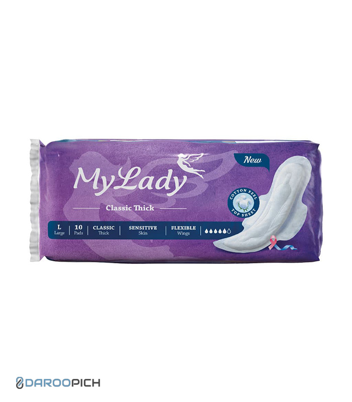 نوار بهداشتی کلاسیک بنفش پنبهای مای لیدی سایز بزرگ: نرم، ضد حساسیت، با جذب بالا برای محافظت کامل در روز. همین حالا از داروپیچ بخرید.